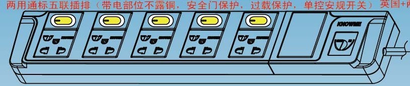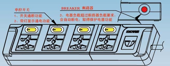 新插座插排:1、过载保护开关功能;2、带指示灯指示功能;3、瞬间电压过高MOV保护功能;